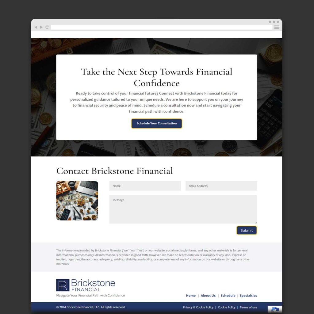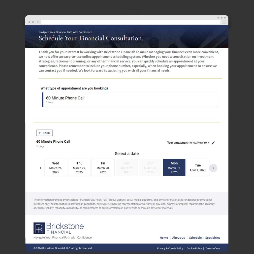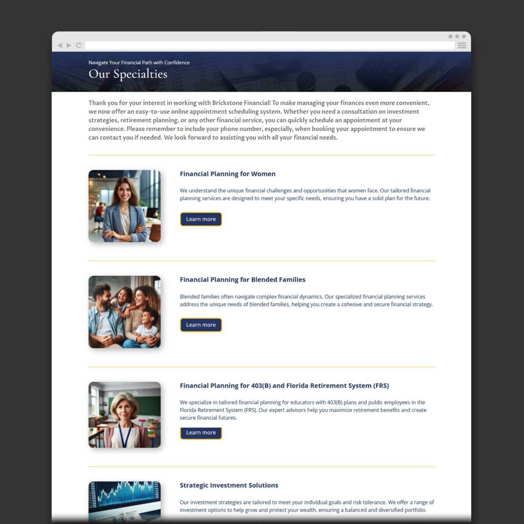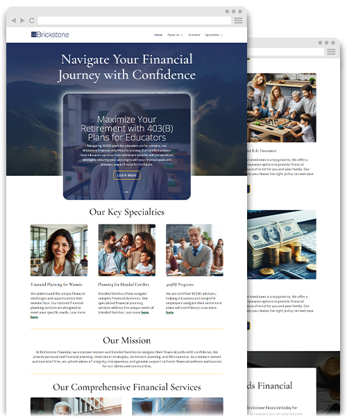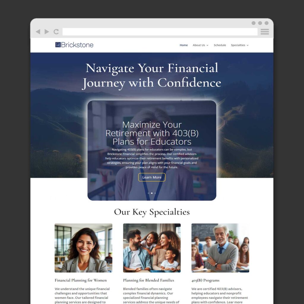 Brickstone Financial transformed its online presence to better serve women and blended families. Research showed these groups were underserved in the financial industry. Empathetic and impactful website content was developed to meet their needs. A cohesive visual identity, including a logo and color palette, was created to convey warmth, trust, and empowerment. To reduce friction for potential customer engagement, an online scheduling system was added, allowing clients to easily book appointments and consultations. These efforts ensured that Brickstone Financial could build meaningful connections with their target audience, ultimately strengthening the brand’s relationship with its customers.